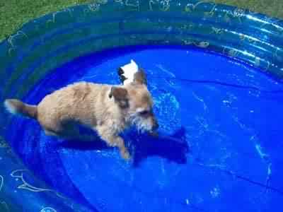 | Neuerdings habe ich einen festen Spielkameraden der mit mir und meinem Temperament und meiner Ausdauer mithalten kann. DJ ist ein kleiner Jack Russel Terrier und wir treffen uns immer mittwochabends und gehen dann zwei Stunden miteinander spazieren oder toben auf der Wiese rum und im Bach und wieder auf der Wiese. Und wenn ich nicht mit DJ spiele, spielen meine Frauchen viel mit mir. Ich habe eine ganz große Frisbee die mein ganzer Stolz ist. Mit der kann ich stundenlang spielen, genauso wie mit meinem Huhn, meiner Ente und meinem Lamm. Auch mit den Katzen spiele ich manchmal, was denen nicht immer gefällt : Wir haben jetzt auch ein Planschbecken im Garten stehen nur für uns… und wenn es richtig heiß ist gehen wir schon mal ne Runde schwimmen. Das mache ich mittlerweile auch sehr gerne, aber so eine Wasserratte wie die Leila werde ich wohl nie. Mit Wasser bin ich nämlich noch immer sehr vorsichtig. |